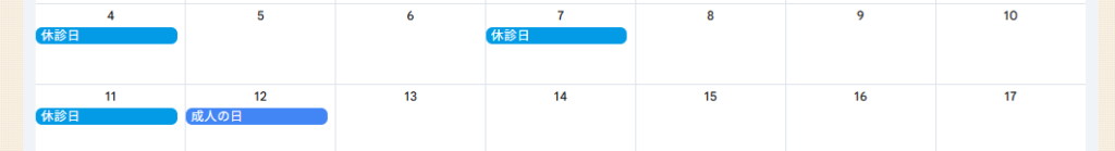 1月12日(月)が祝日(成人の日)となるため休診とし、1月14日(水)に振り替えます。