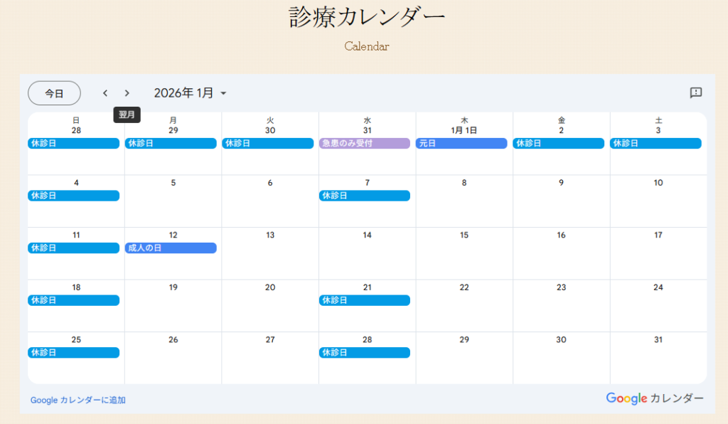 その他の日は、暦通り診療いたします(水・日が休診)。